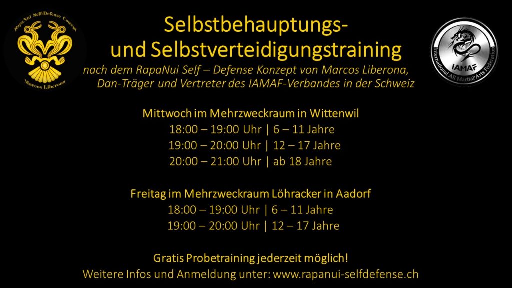 Vor den Frühlingsferien 2024 konnten wir unseren Grundlagenkurs für Erwachsene erfolgreich abschliessen. Da die Trainings sowohl unseren Teilnehmern als auch uns sehr viel Freude bereitet haben, bleibt das Trainingsangebot für Alle ab 18 Jahren bestehen! Trainiert wird immer mittwochs von 20 bis 21 Uhr in im MZR der Schule in Wittenwil! Du kannst jederzeit einsteigen und unter professioneller Anleitung etwas für deinen Selbstschutz und deine körperliche Fitness tun! Wir freuen uns auf Dich!